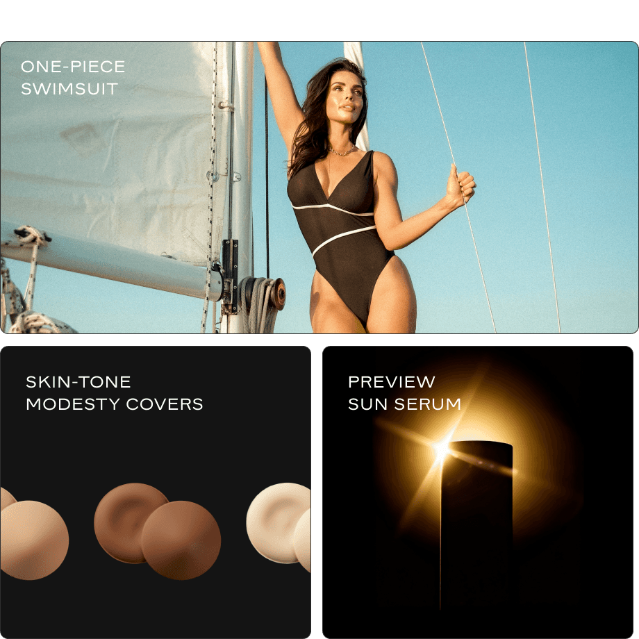 Each suit comes with a sample of our upcoming sun serum, a zinc and antioxidant-rich formula crafted to shield and restore skin under the sun.